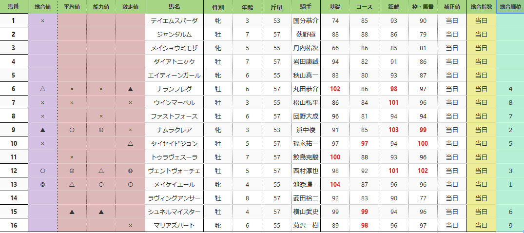 指数上は平均値だが、能力は高く、高松宮記念を除けば、勝負強さの末脚が発揮できそう。
