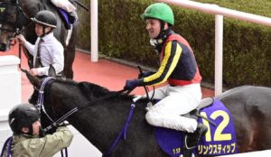 レース後もジョッキーの騎乗服に泥が付着が見られました。